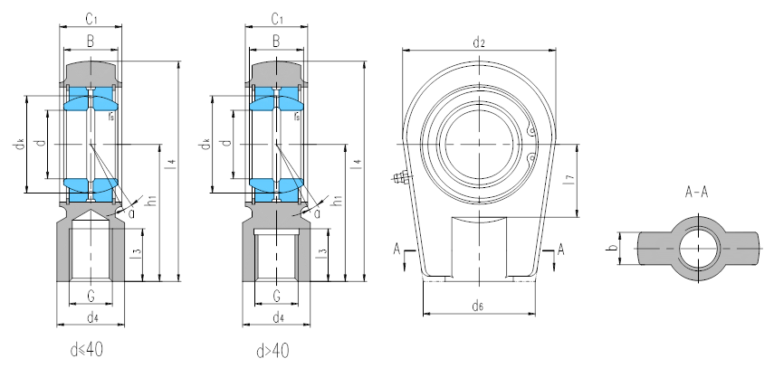 產品特點:帶鎖口桿端關節軸承由桿端體和向心關節軸承GE…ES組裝而成,用擋圈固定,d<60,桿端體材料是碳鋼,60≤d≤90,桿端體材料是碳鋼或球墨鑄鐵,d>90,桿端體材料是球墨鑄鐵,SIR…ES桿端體的內螺紋帶有鎖口,配有螺釘緊固;SIRN…ES桿端體無鎖緊螺釘,均可通過油杯潤滑。