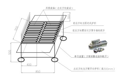 * 1.44車廂臺面裝有滾軸,左右方向(牽引方向為前后方向)滾動,左右方向設計有方便開合的防護欄,方便裝卸貨。
