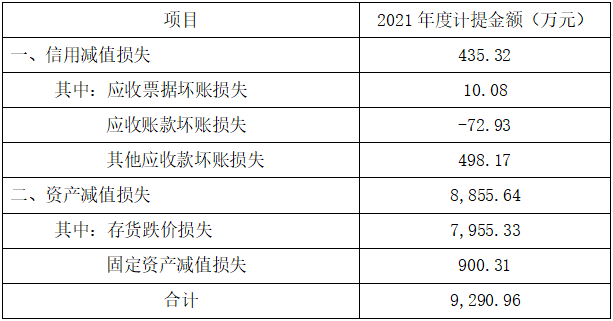 2021年公司確認的資產減值損失及信用減值損失總額為9,290.96萬元,相應減少當年利潤總額9,290.96萬元。本次計提資產減值準備符合會計準則和相關政策要求,不存在損害公司和全體股東利益的情形。本次計提資產減值準備已經年審會計師事務所審計確認。
