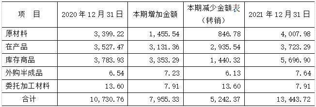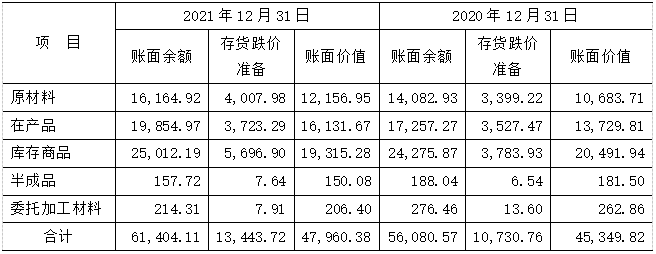 資產負債表日,公司對各項存貨的成本與可變現凈值比較,存貨成本高于其可變現凈值的,計提存貨跌價準備,計入當期損益。2021年公司存貨分類情況如下表(萬元):