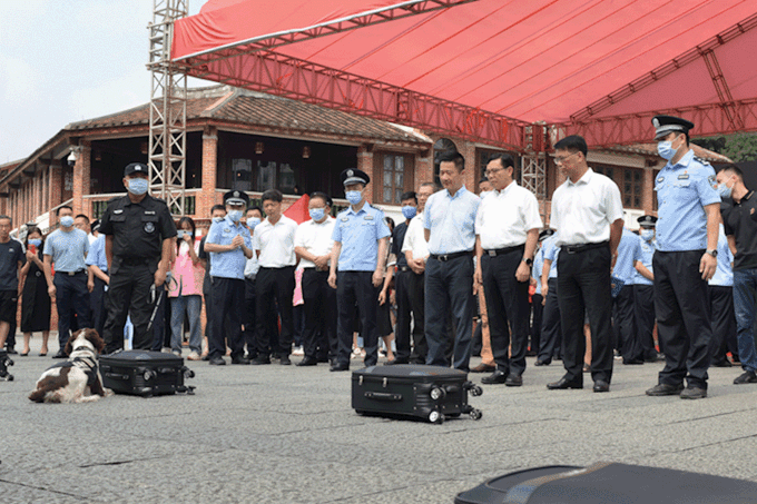 緝毒犬查緝表演區(qū)緝毒犬現(xiàn)場表演查緝快遞中隱藏的毒品,展示了緝毒犬精準查毒技巧,貼近實戰(zhàn)形式,吸引過往群眾駐足觀看。
