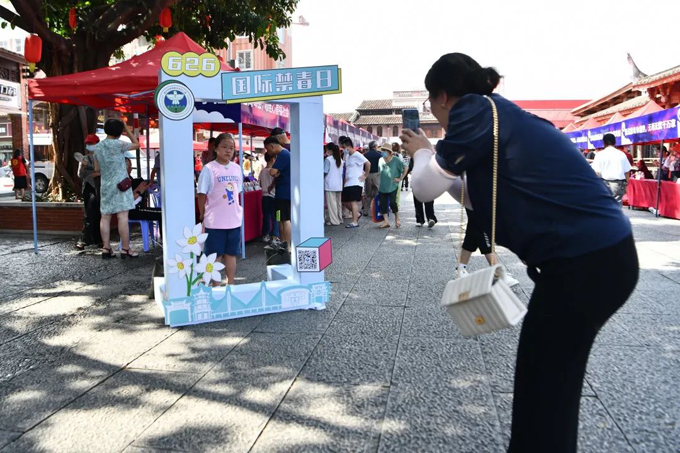 拍照打卡區(qū)現(xiàn)場設立具有禁毒元素的立體拍照打卡框,吸引了不少群眾發(fā)揮創(chuàng)意、拍照打卡。