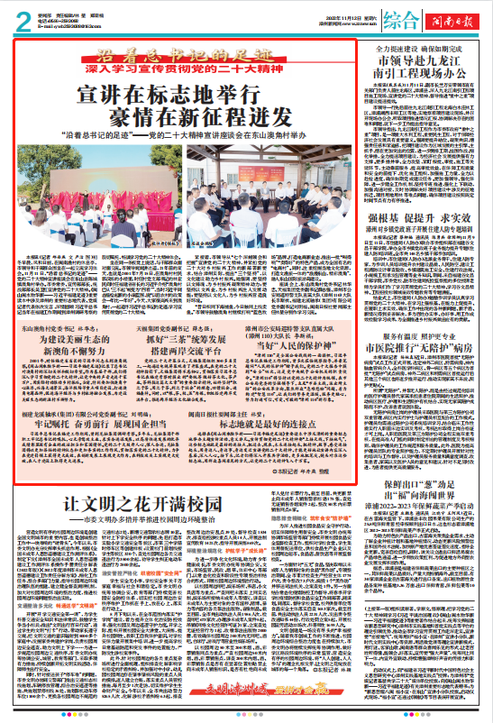 本報訊(記者 邱丹燕 文 嚴潔 圖)初冬早晨,風和日麗,在閩南漁村的休息亭,市領導和干部群眾圍坐在一起交流學習體會。11月11日,“沿著總書記的足跡”——黨的二十大精神宣講座談會在東山縣陳城鎮(zhèn)澳角村舉辦。市委常委、宣傳部部長、統戰(zhàn)部部長吳衛(wèi)紅宣講黨的二十大精神。《閩山閩水物華新——習近平福建足跡》重要讀本中涉及漳州的重要標志地代表、黨媒記者代表依次發(fā)言,深情回顧習近平總書記當年在福建工作期間到漳州調研考察的殷切囑托,暢談學習黨的二十大精神體會。