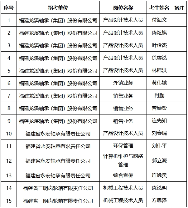 根據(jù)《福建龍溪軸承(集團)股份有限公司2024年公開招聘公告》有關(guān)規(guī)定,經(jīng)筆試、面試等程序,現(xiàn)將集團本部及權(quán)屬企業(yè)(福建省永安軸承有限責任公司、福建省三明齒輪箱有限責任公司)擬聘用人員予以公示,公示期為5個工作日,公示名單如下: