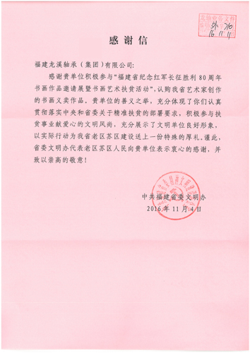 近日,一封感謝信寄到了公司。原來,為感謝公司積極參與“福建省紀(jì)念紅軍長征勝利80周年書畫作品邀請展暨書畫藝術(shù)扶貧活動”,認(rèn)購我省藝術(shù)家書畫義賣作品,為我省老區(qū)蘇區(qū)建設(shè)貢獻(xiàn)一份力量,省委文明辦特意寄來了這封感謝信。