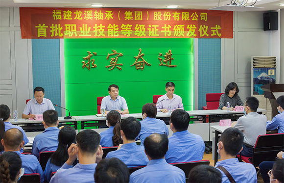 2020年11月19日上午,龍軸集團(tuán)首批職業(yè)技能等級證書頒發(fā)儀式在公司二樓會議室隆重舉行。這是漳州市首家按照“誰評價、誰發(fā)證、誰負(fù)責(zé)”原則對首批163名通過企業(yè)職業(yè)技能等級認(rèn)定考核的職工頒發(fā)技能等級證書。漳州市人力資源和社會保障局副局長林貴達(dá),龍軸集團(tuán)黨委書記、董事長陳晉輝,黨委副書記劉明福等領(lǐng)導(dǎo)出席頒證儀式,40多名取得首批公司職業(yè)技能等級證書的職工代表及考評員代表參加。頒證儀式由劉明福主持。