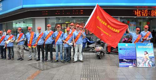 (圖a)志愿者深入到龍軸新村延安北路街頭,為過往行人分發(fā)安全生產(chǎn)宣傳資料。