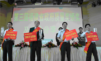 2012年10月19日上午,第三屆福建省政府質量獎頒獎大會在莆田召開,我司被福建省人民政府授予“2011年度福建省政府質量獎”,成為我市首家榮獲此獎項的企業(yè)。福建省質量技術監(jiān)督局局長黃維禮、莆田市人民政府市長梁建勇等領導出席大會并為獲獎單位頒獎,圖為公司黨委書記、董事長曾凡沛接受獎杯和獎金。