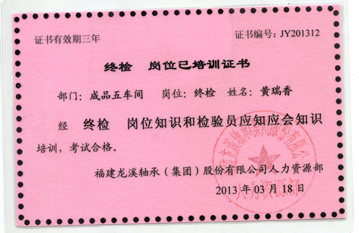 終檢崗位培訓證書
